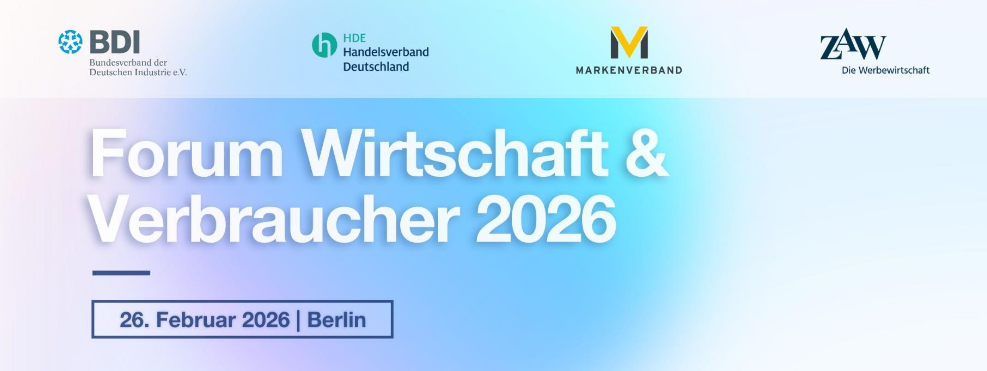 | Gemeinsam mit dem Handelsverband Deutschland (HDE), dem Markenverband und dem Zentralverband der Deutschen Werbewirtschaft (ZAW) veranstaltet der Bundesverband der Deutschen Industrie auch im kommenden Jahr wieder das „Forum Wirtschaft und Verbraucher“, um über aktuelle Themen der europäischen und nationalen Verbraucherpolitik zu diskutieren. Es findet am 26. Februar 2026 von 15:00 bis 18:30 Uhr im Haus der Commerzbank am Pariser Platz in Berlin statt. Im ersten Block unserer diesjährigen Veranstaltung geht der Blick nach Brüssel. Welche Schwerpunkte setzt die EU-Kommission mit ihrer Verbraucheragenda 2025 – 2030? Wie gelingt es, die Erwartungen der Unternehmen auf Entlastung und Wettbewerbsförderung mit den Erwartungen der Verbraucher an die europäische Politik zu verbinden? Zum Programm