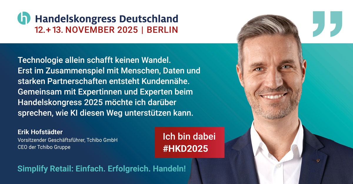 | | Erik Hofstädter beim Handelskongress Deutschland 2025 |    |  Wir freuen uns, Erik Hofstädter, Vorsitzender der Geschäftsführung der Tchibo GmbH und CEO der Tchibo Gruppe, beim Handelskongress Deutschland im November begrüßen zu dürfen. Als erfahrener Branchenexperte wird er spannende Einblicke in das Thema Kundennähe durch smarte Technologien geben. Dabei zeigt er, warum technologische Innovation allein nicht ausreicht, um echte Veränderung zu bewirken. Erst das Zusammenspiel von Menschen, Daten und starken Partnerschaften schafft Nähe zum Kunden – und damit nachhaltigen Erfolg im Handel.   Sichern Sie sich jetzt Ihr Ticket für den Handelskongress Deutschland am 12. und 13. November 2025 in Berlin und seien Sie dabei.