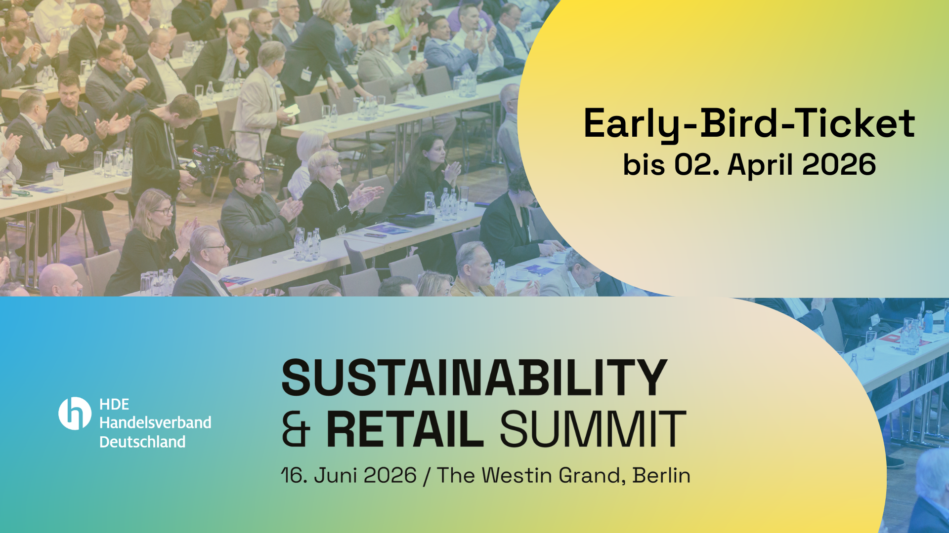 | | Letzte Chance: Early-Bird-Ticket für den HDE Sustainability & Retail Summit 2026 |  | Das Programm des HDE Sustainability & Retail Summit 2026 ist jetzt online und zeigt die inhaltliche Bandbreite und Qualität des Kongresses – mit hochkarätigen Speakern, fundierten Einordnungen und praxisnahen Perspektiven aus Handel, Politik und Wirtschaft. Im Fokus stehen zentrale Fragen der nachhaltigen Transformation – von regulatorischen Entwicklungen bis hin zu konkreten Umsetzungsstrategien in Unternehmen. Der Summit bietet damit eine Plattform für fundierten Austausch und neue Impulse auf Entscheider-Ebene.