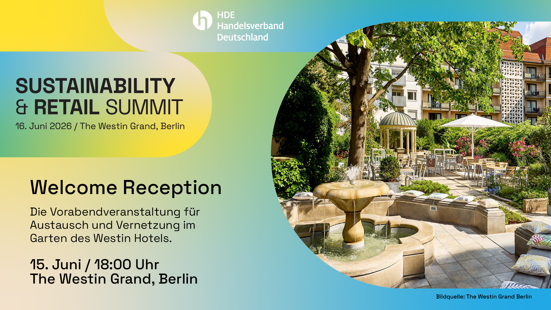 | | Auftakt in besonderer Atmosphäre – der Vorabend des Summits |  | Bereits am Vorabend des HDE Sustainability & Retail Summit 2026 bietet sich die Gelegenheit für erste Gespräche und neue Verbindungen. In entspannter Atmosphäre im Garten des Veranstaltungshotels kommen Vertreterinnen und Vertreter aus Handel, Politik, Wirtschaft und Wissenschaft zusammen, um Perspektiven auszutauschen und aktuelle Entwicklungen zu diskutieren. Der Abend schafft Raum für persönlichen Dialog und inhaltliche Annäherung – jenseits des offiziellen Programms. Damit setzt er den passenden Rahmen für einen Kongresstag, der die nachhaltige Transformation des Handels in den Mittelpunkt stellt.